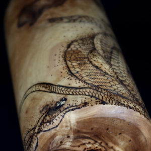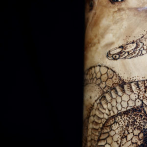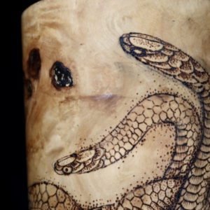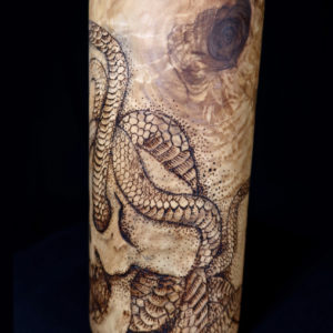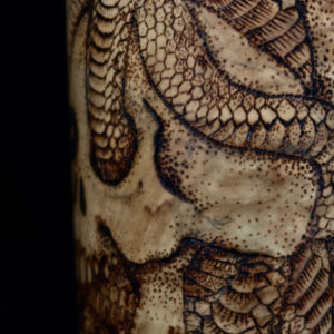 In questa opera unica Crez ha giocato con il movimento sinuoso dei serpenti che attraversano le forme di un teschio.